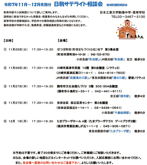| 9 | 11月29日(土) | 14:30~ 入試ワンポイントアドバイス・入試要項 |